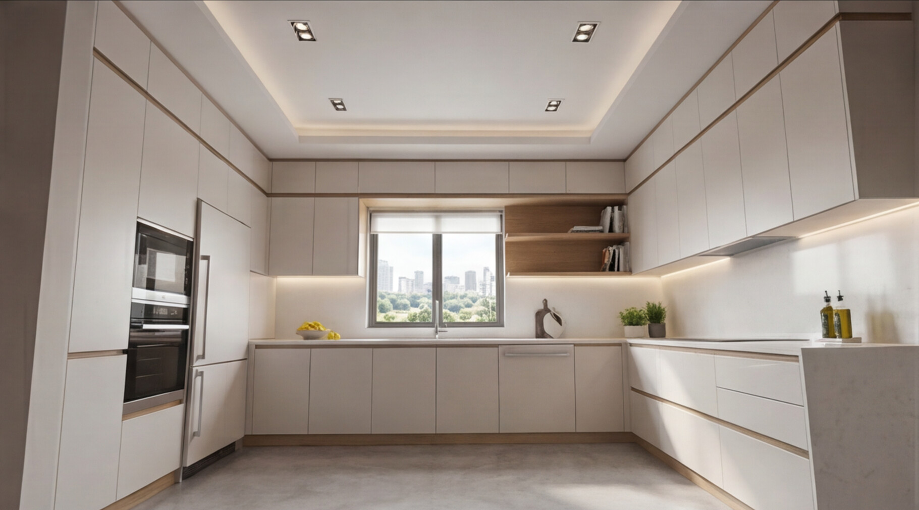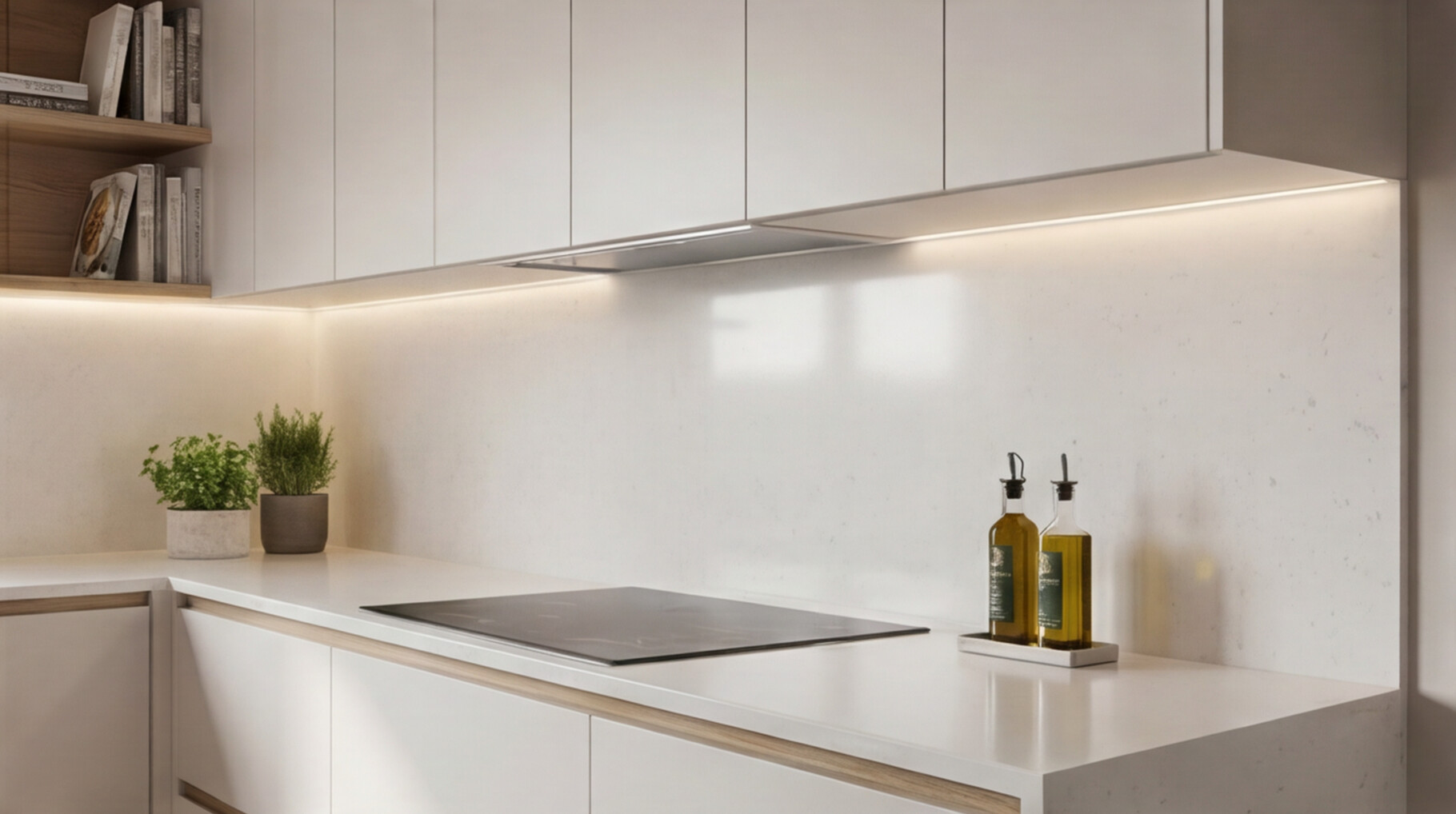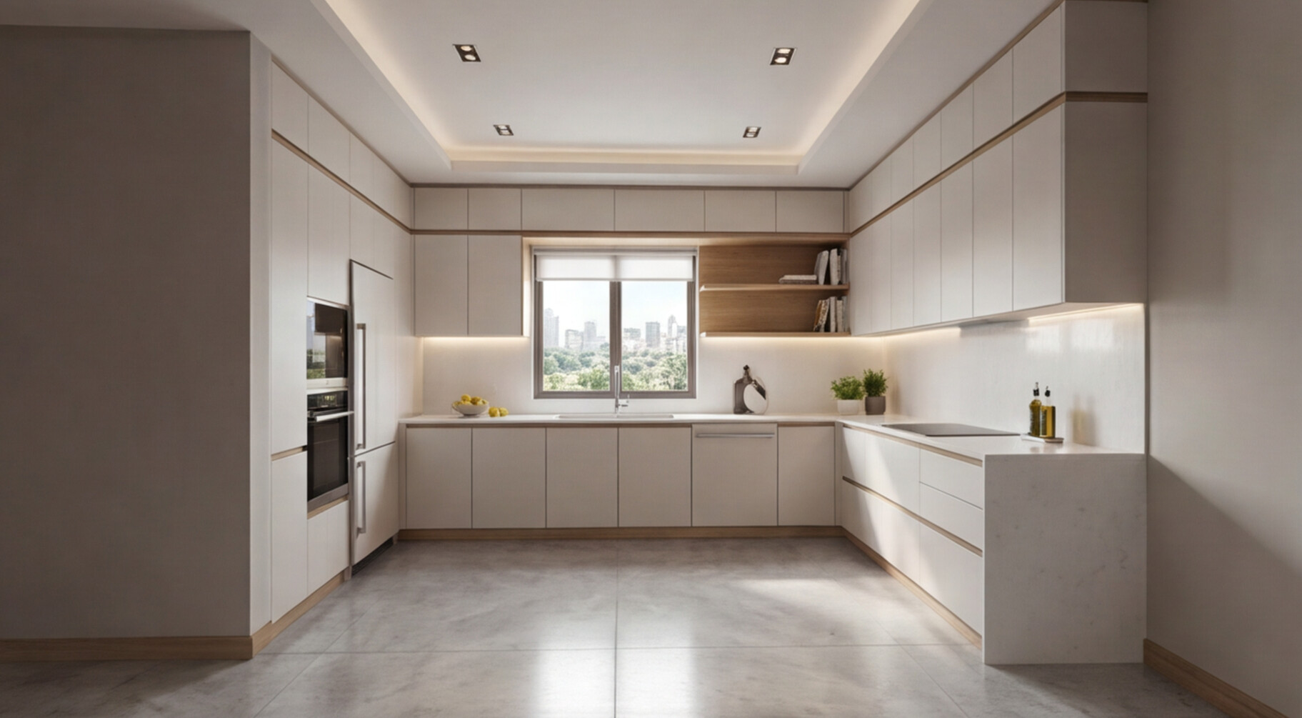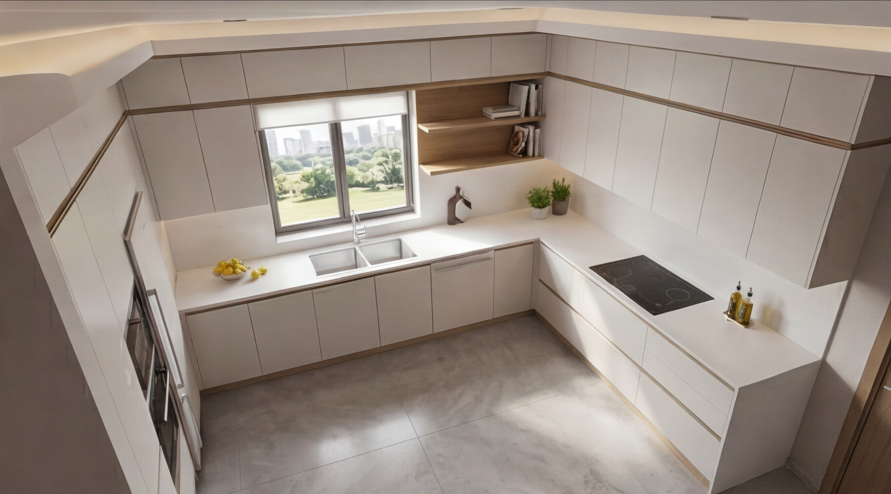 Белая кварцевая столешница, плавно объединяющая все три стороны кухни, формирует цельную рабочую поверхность с высокой практичностью и премиальным внешним видом. Такое решение не только удобно в ежедневной эксплуатации, но и усиливает архитектурную целостность композиции. Скрытые системы открывания, строгая геометрия фасадов и отсутствие визуального шума делают кухню стильной, современной и долговечной.