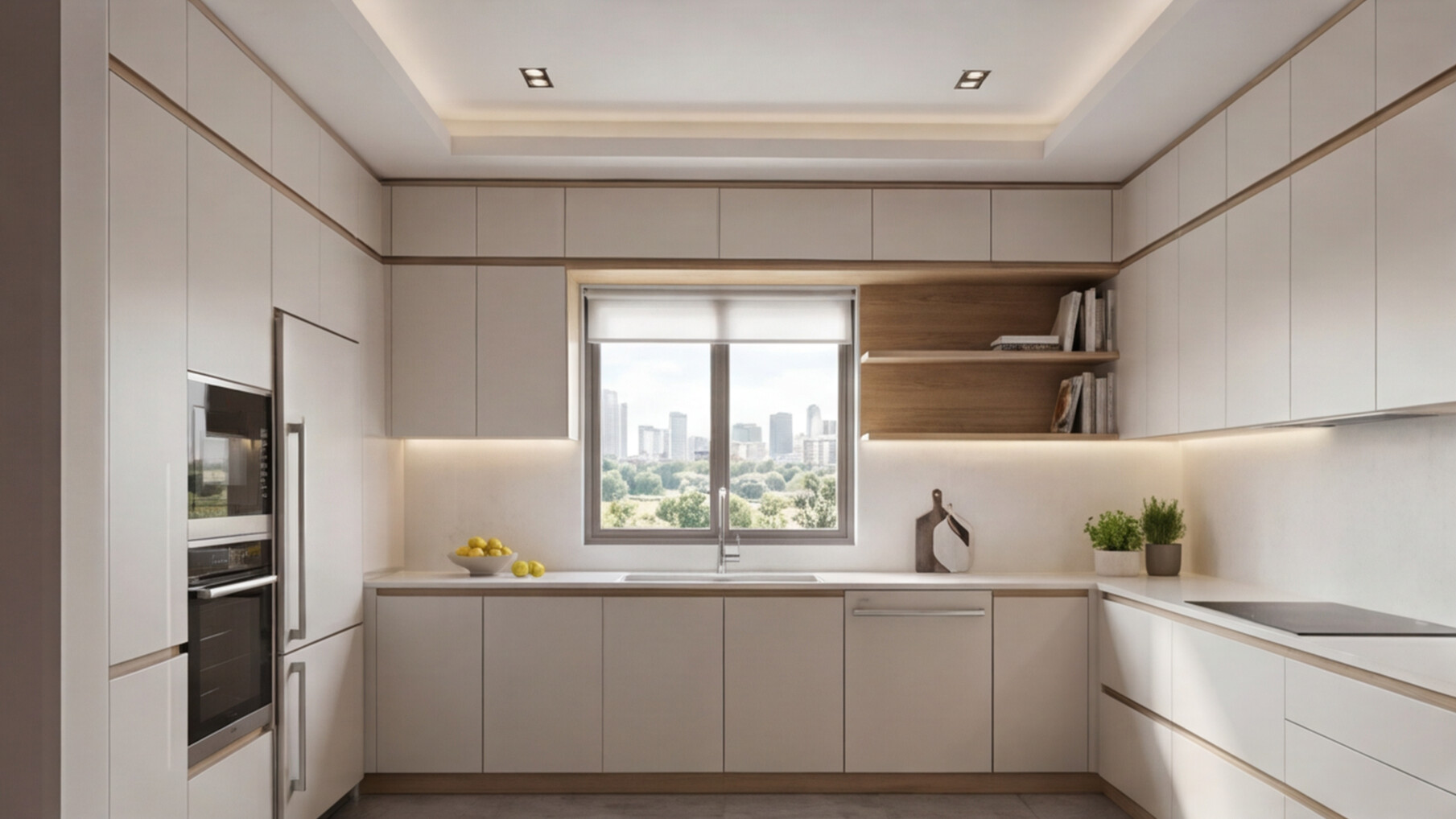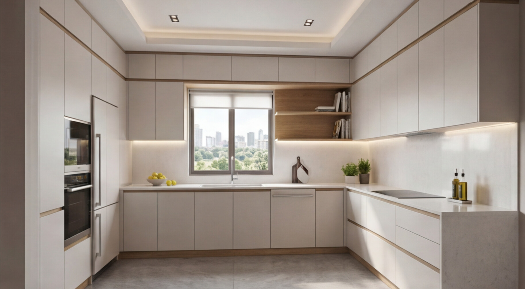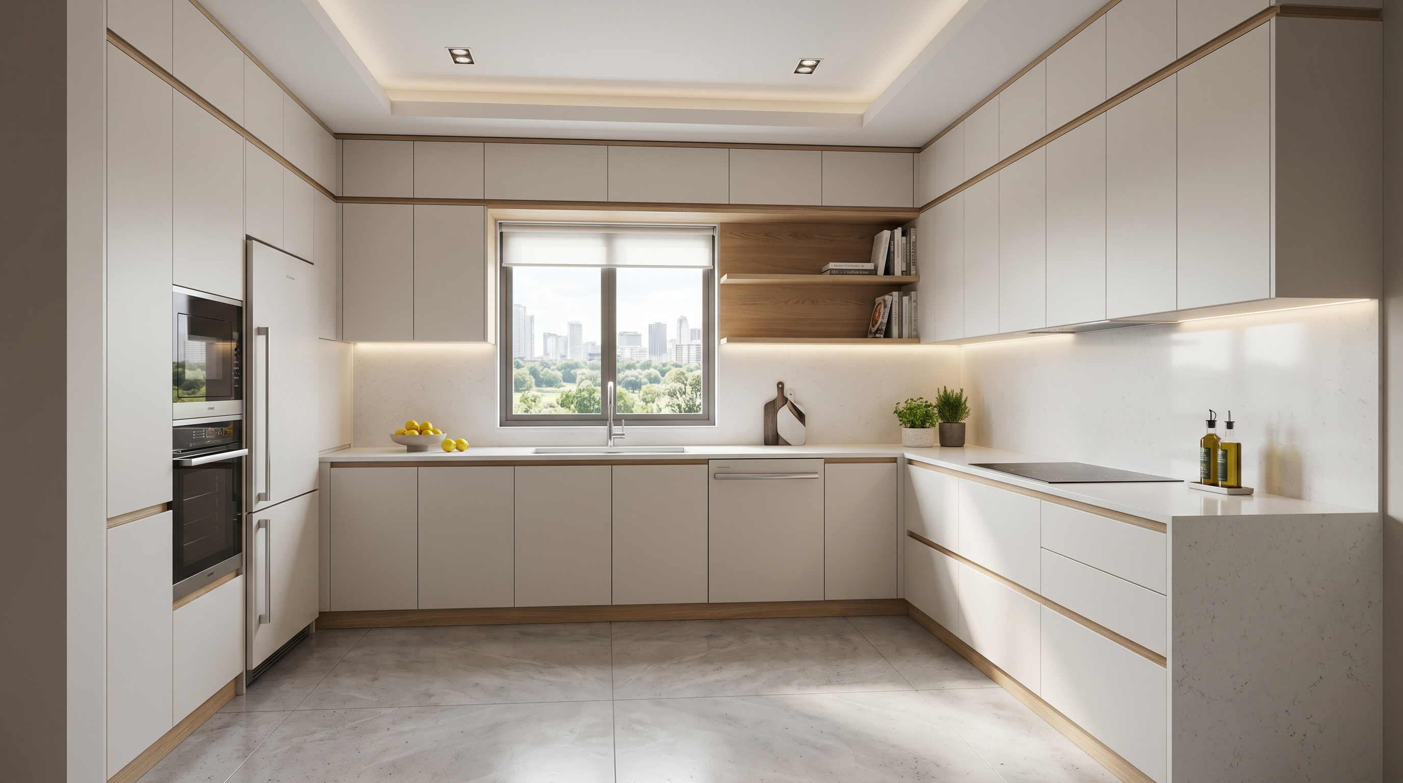 Компактная П-образная кухня 3 м в светлой скандинавской эстетике: матовые белые фасады, акценты под светлый дуб, кварцевая столешница и эргономичная U-образная планировка.