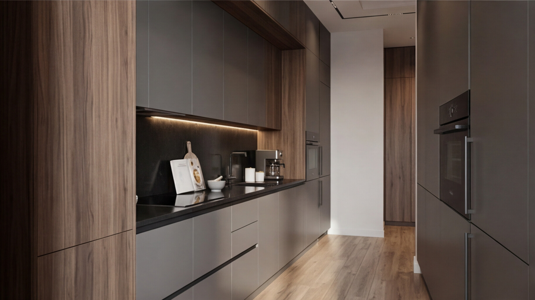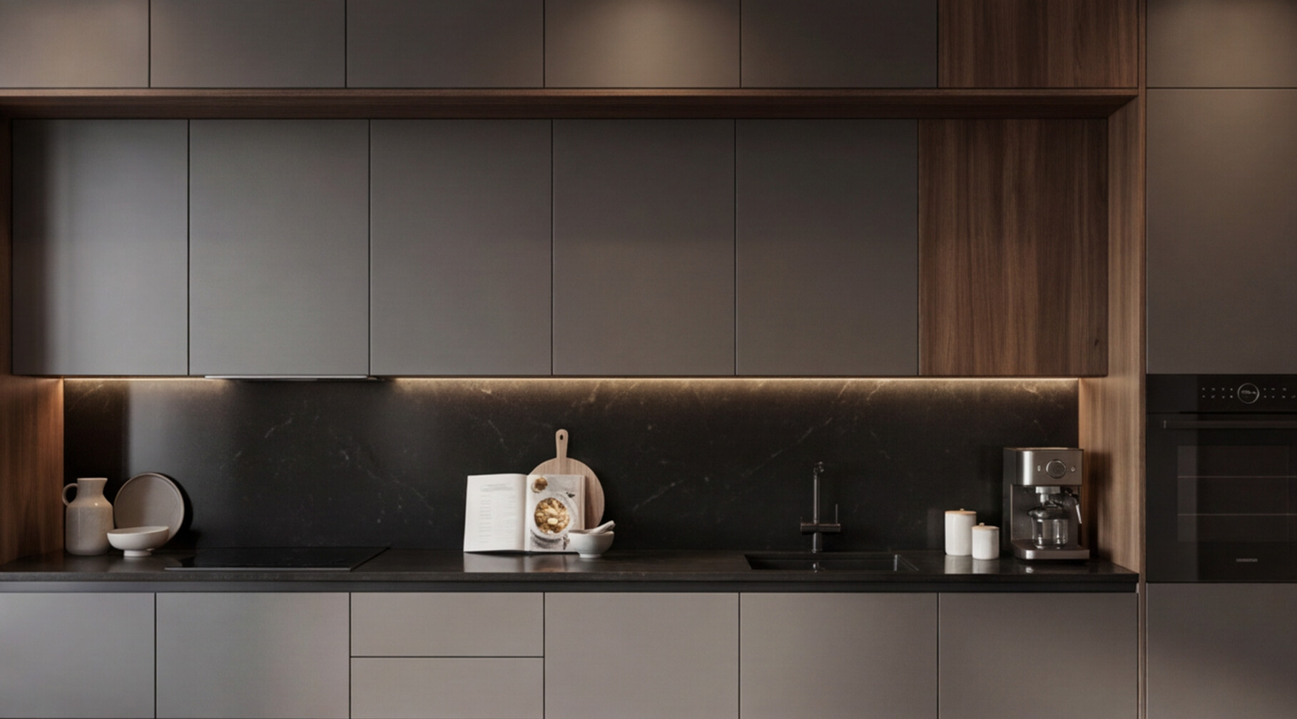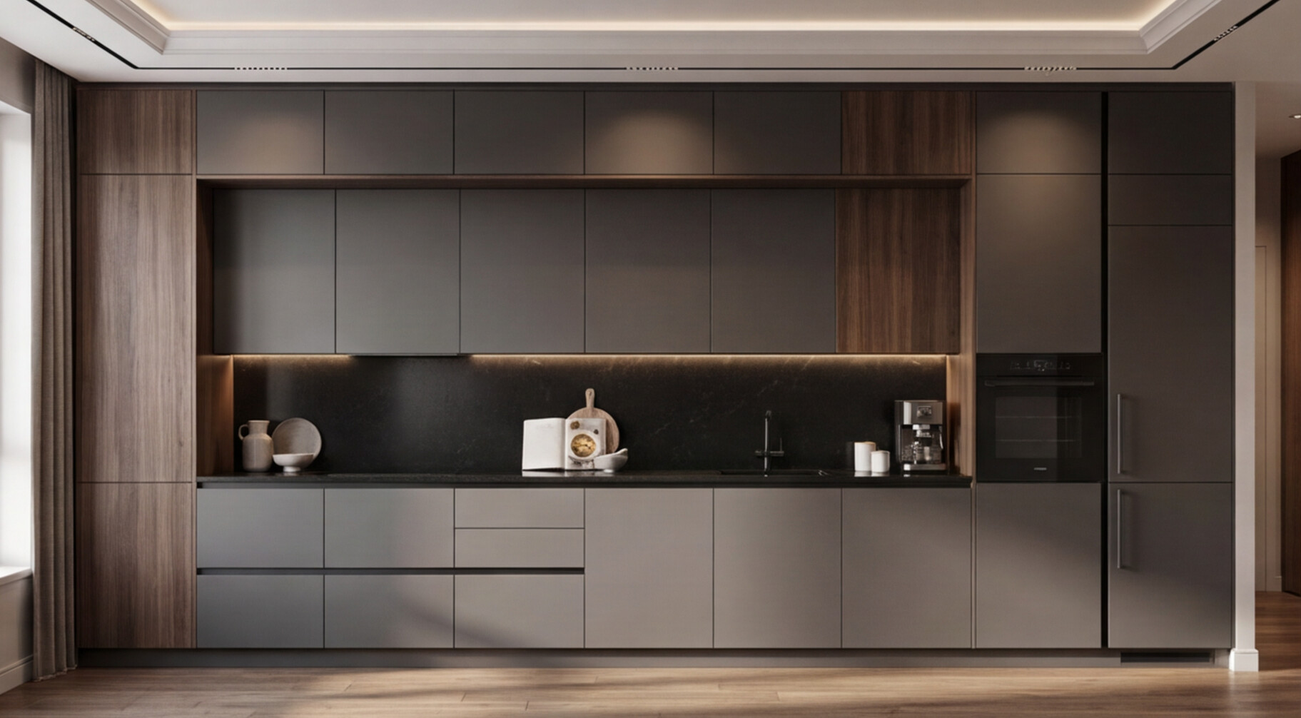 Матовые графитовые фасады создают глубокий благородный характер интерьера, подчеркивая статусность пространства, а панели под темный орех добавляют композиции теплоту натуральной текстуры и визуальную глубину. Черная каменная столешница усиливает ощущение монолитности и дорогого исполнения, формируя цельный современный образ.