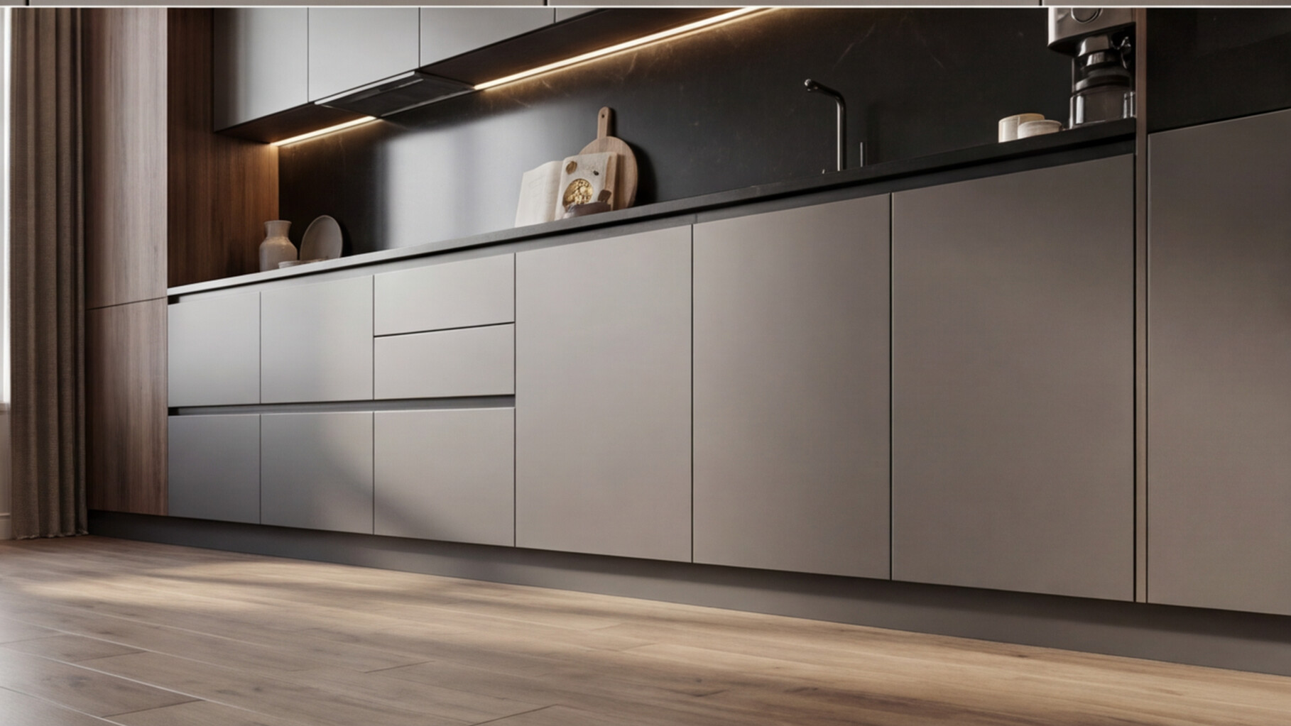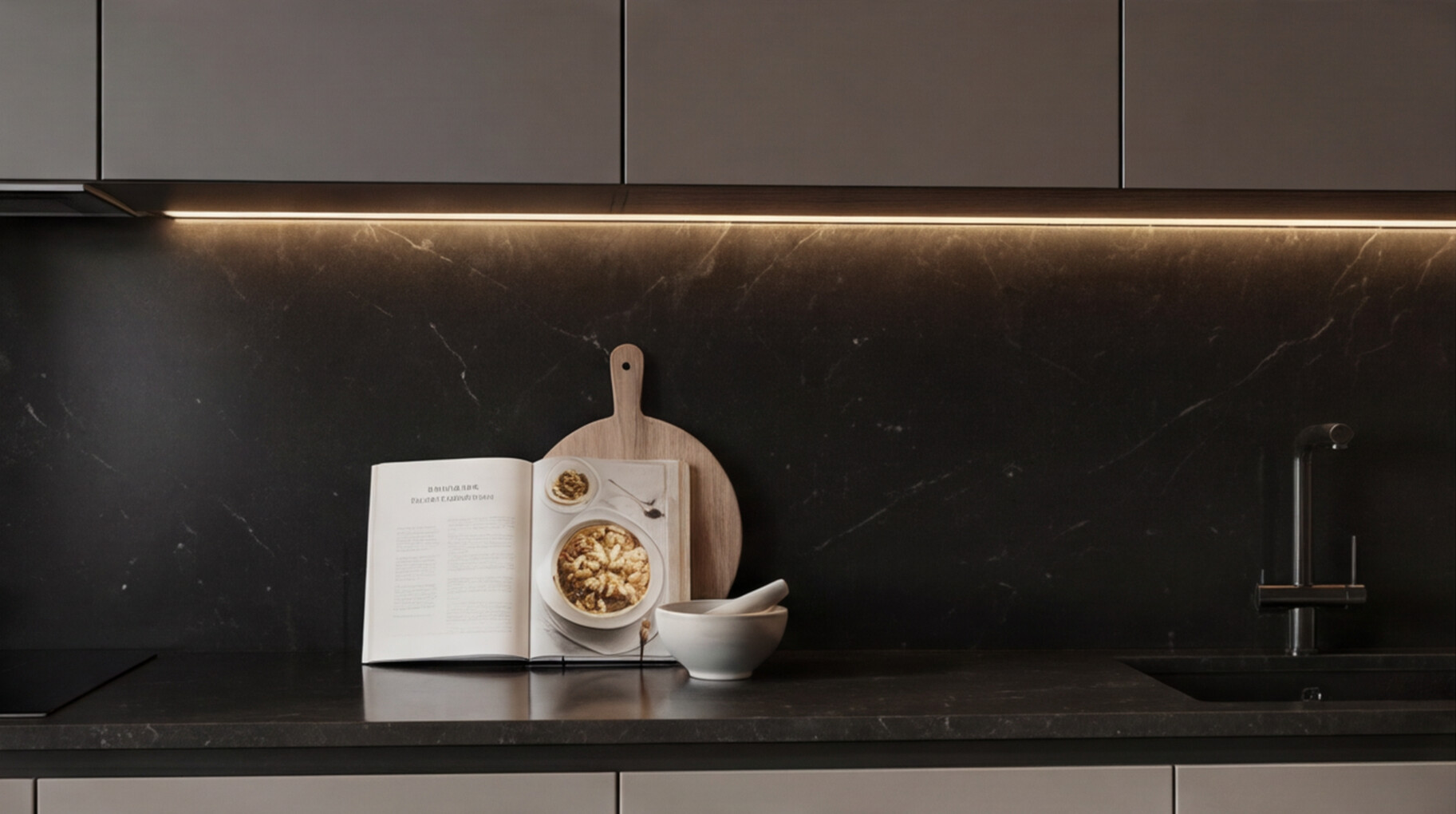 Интегрированная LED-подсветка под верхними модулями делает пространство более выразительным, добавляя мягкое функциональное освещение и подчеркивая архитектуру кухни. Скрытые системы открывания, встроенная техника и четкая геометрия фасадов создают минималистичную эстетику без лишних деталей.