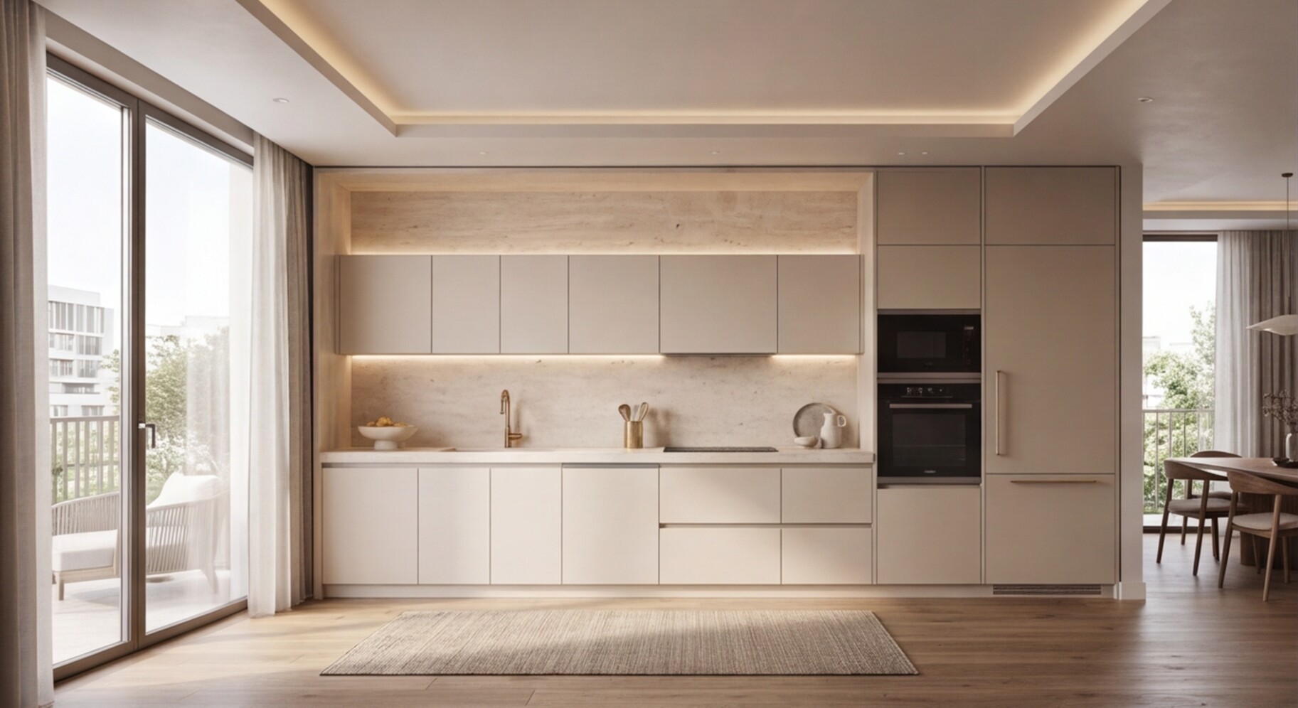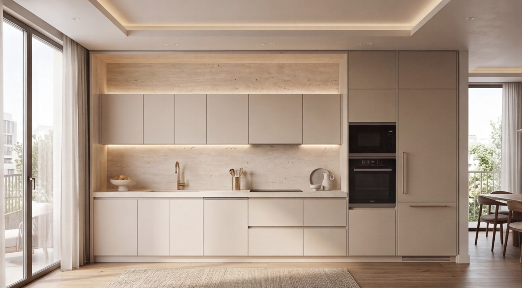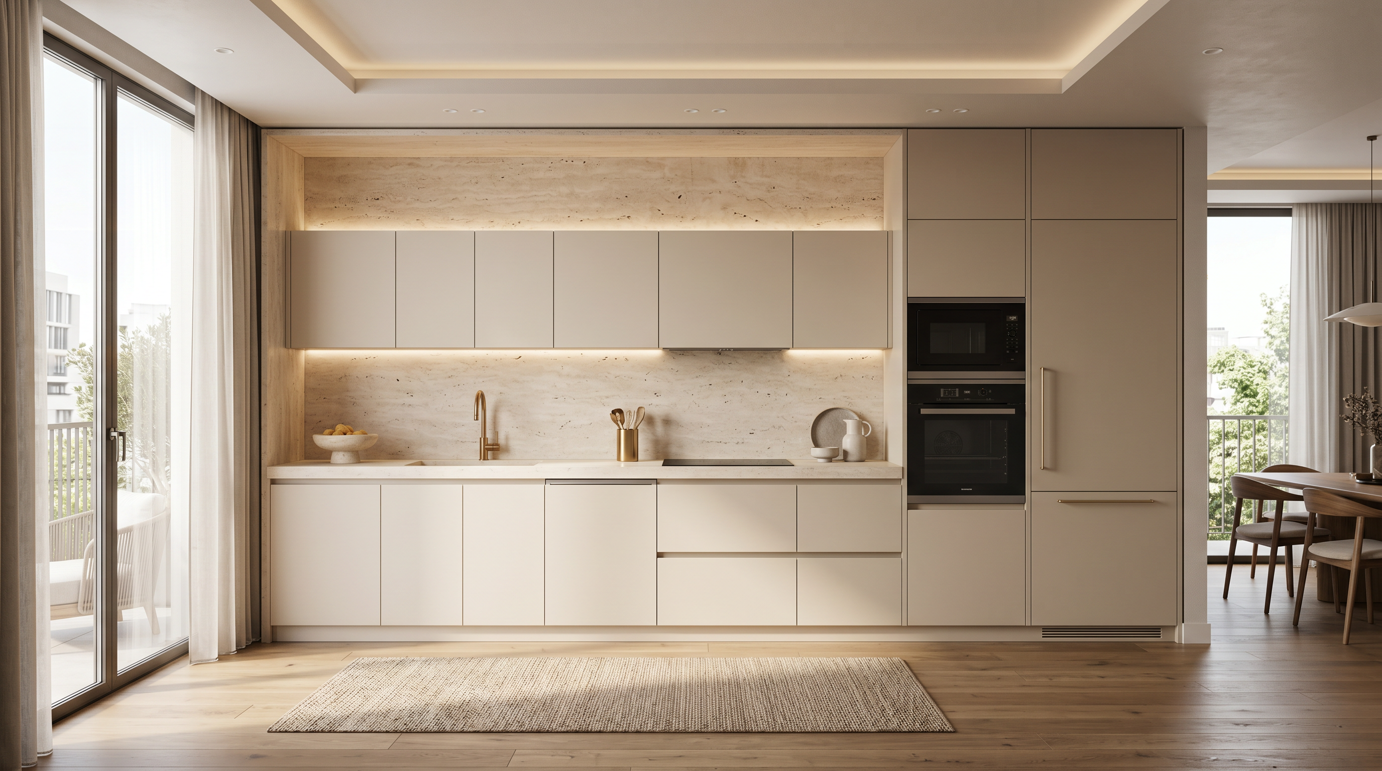Прямая кухня «Травертин Беж 3.6» — это воплощение спокойной современной роскоши, где натуральные оттенки, архитектурная чистота и функциональность объединяются в цельное премиальное пространство.