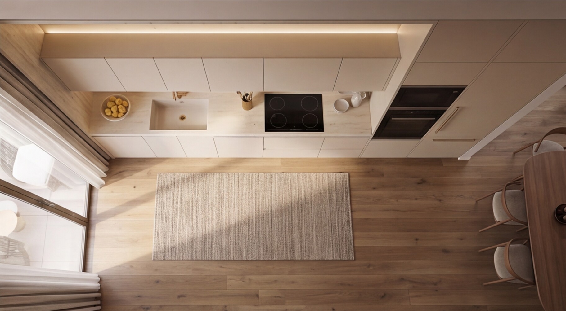 Линейная компоновка длиной 3,6 метра обеспечивает просторную рабочую поверхность, удобную организацию хранения и визуально цельную композицию, идеально подходящую для современных квартир, просторных апартаментов и частных домов. Матовые фасады в мягком бежевом оттенке формируют теплую и светлую атмосферу, создавая ощущение уюта и визуального комфорта.