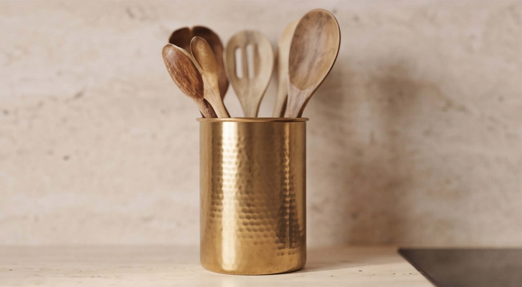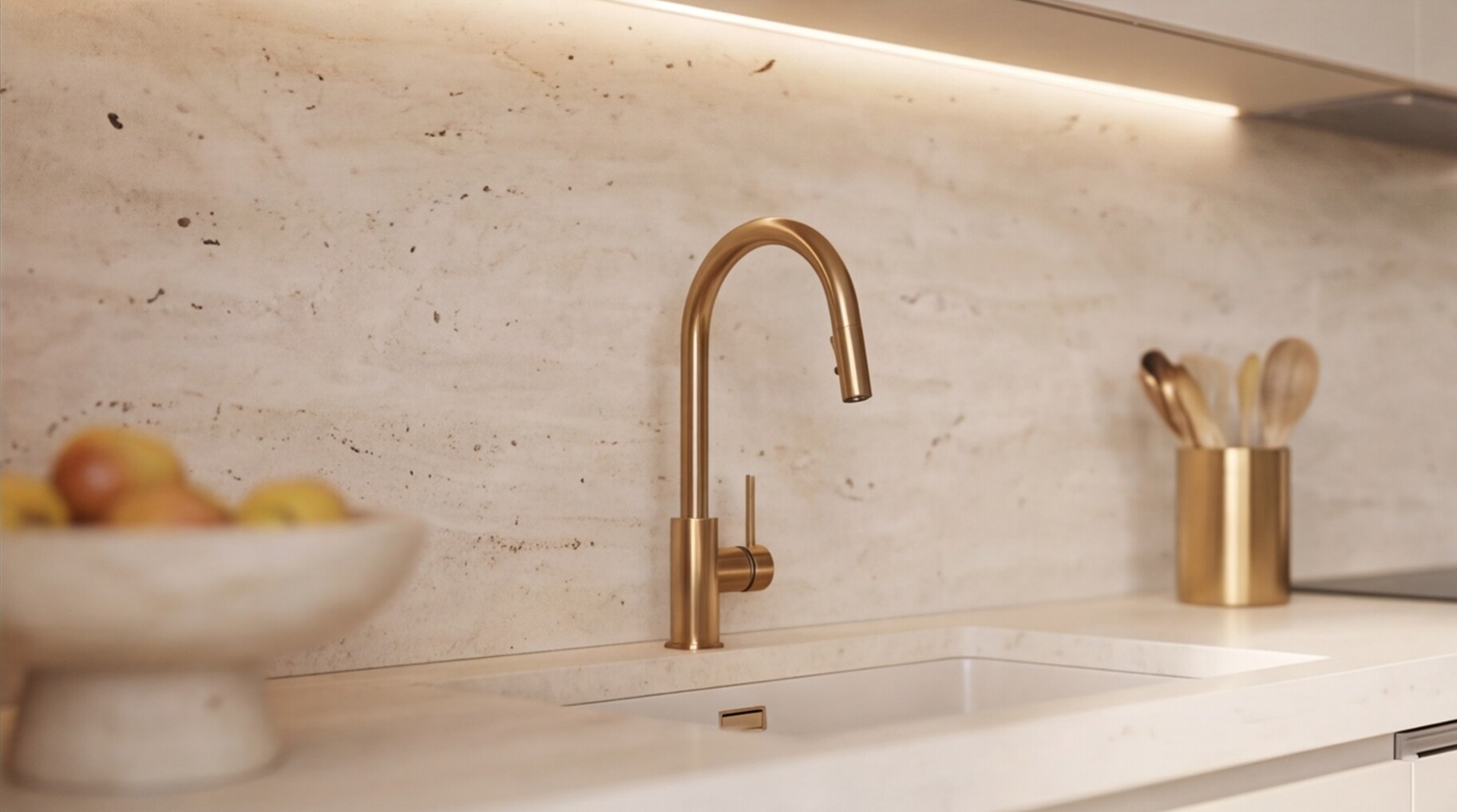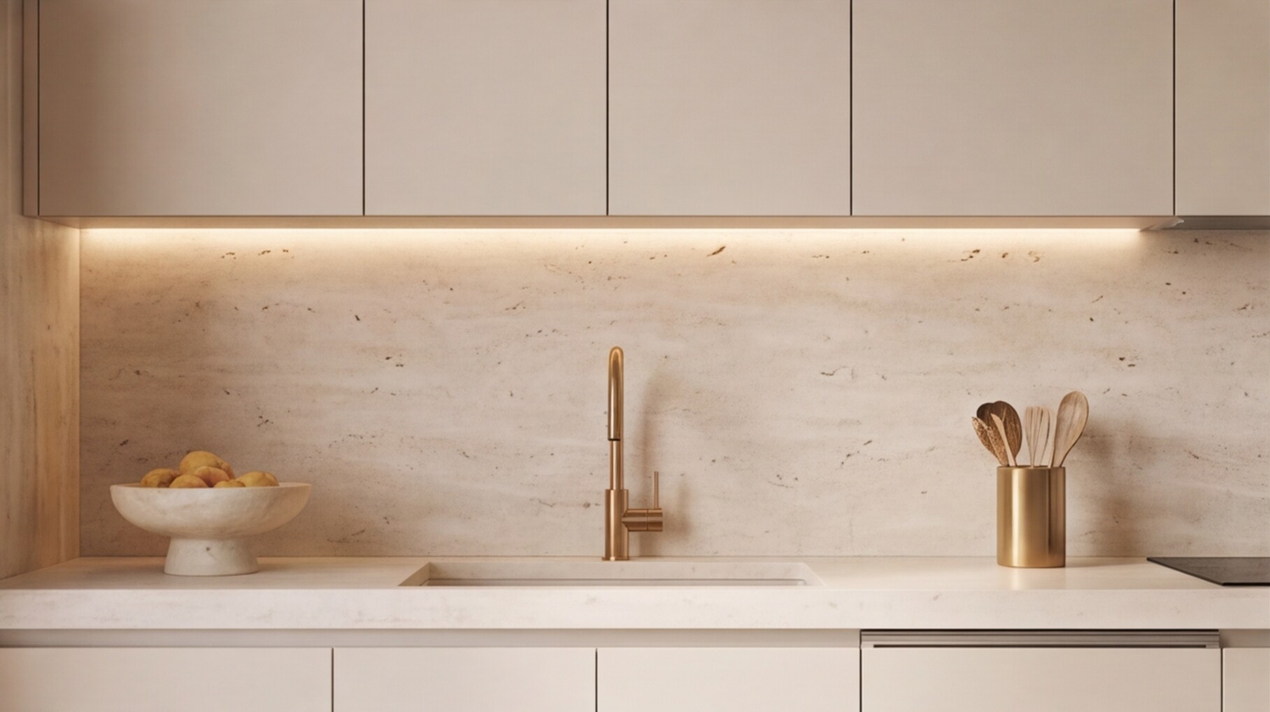 Фартук с текстурой натурального травертина добавляет интерьеру архитектурную выразительность и подчеркивает дорогой характер материалов, а светлая кварцевая столешница завершает образ, обеспечивая долговечность, практичность и эстетическую целостность.